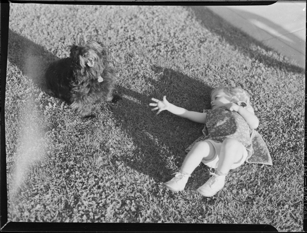 The girl below pops up in few images in the next box also. Street is W Walnut where Joel lived with his mom Clara Pahl but also, his aunt Amy Pahl lived half a block away. This image could very well be taken early 1942 during a visit. And it’s always possible it’s a neighborhood child playing with Butch or one of the puppies.