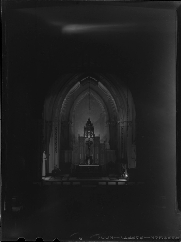 Let’s start with a few images of the Cathedral of the Annunciation, Stockton. It’s clear from the sequence Joel is trying to figure out different light settings, including a bulb flash. It’s a mixed bag when it comes to quality but there are a few workable negatives that could be printed with some work.