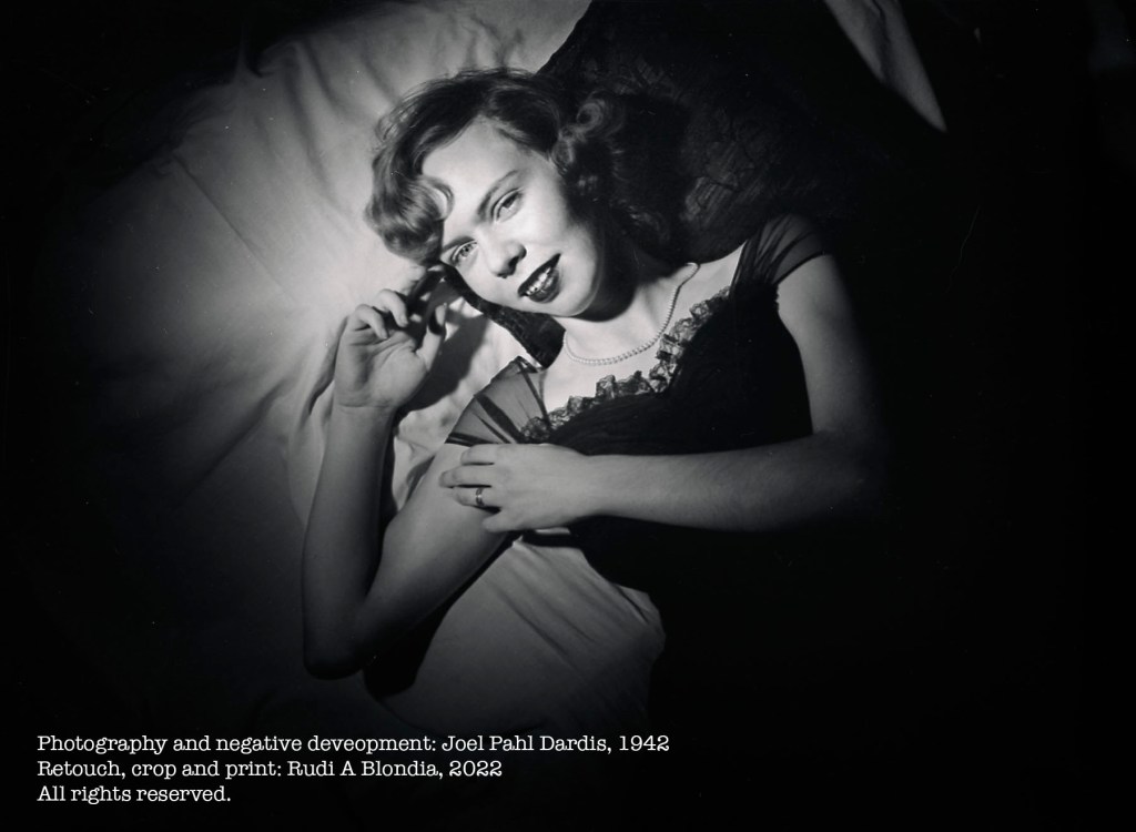 The above image is quite a nice “Hollywood style” portrait and the one below is no exception. It is not clear if Joel printed any of these, I took the liberty to retouch the negative below and post it at the top of the blogpost.