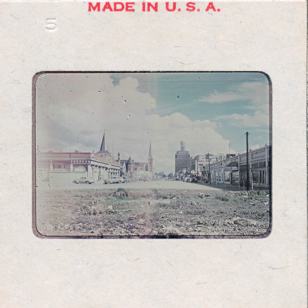 It’s clearly E Miner Avenue, looking east. The Central Methodist Church at Miner and San Joaquin is still there, so definitely prior to 1958. The only board that is clearly in focus is the one from Olson & Pierson, Upholstery Cleaners at 16 E. Miner Avenue. This business showed first up at this address in the 1941 Polk Stockton City Directory and by 1952, that location is listed as vacant as the business moved to E. Fremont Street.