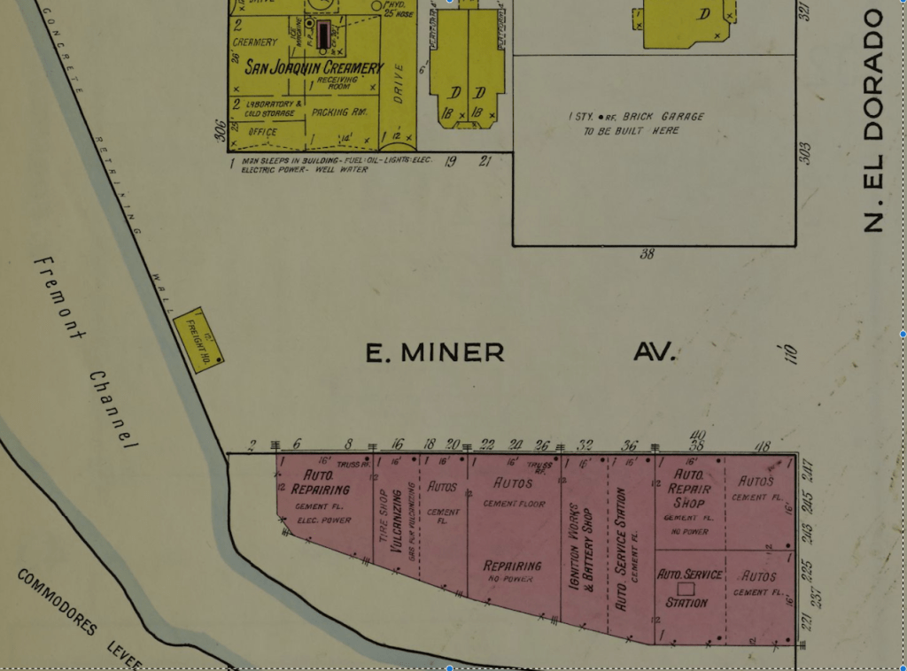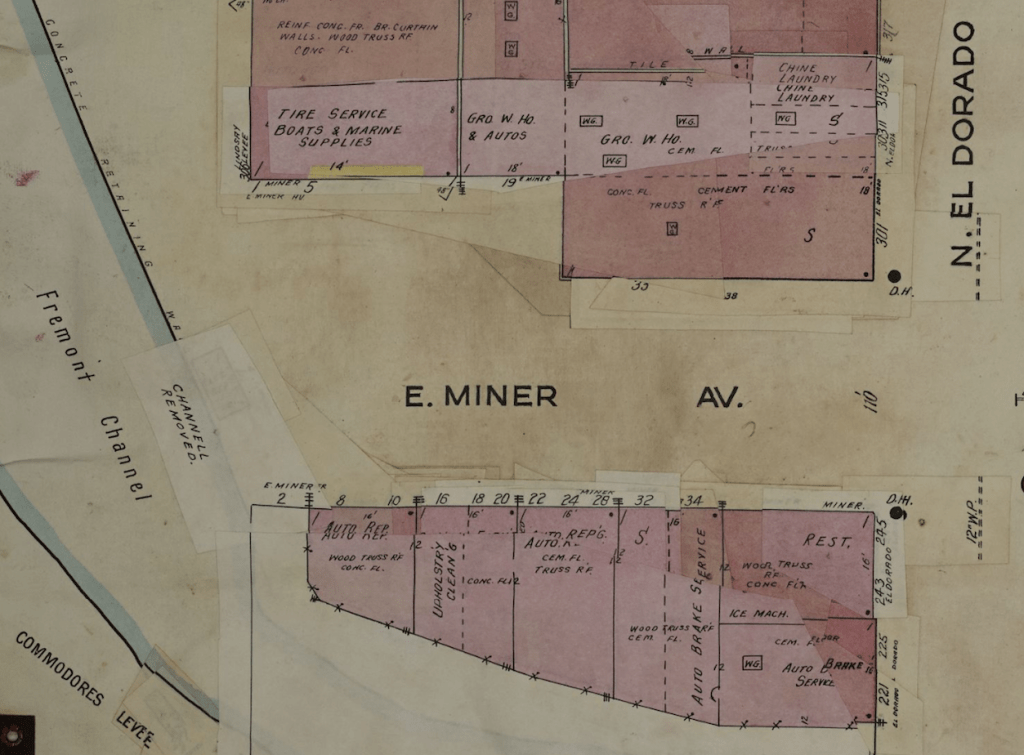 1917 Sanborn Fire Map, Stockton, Fremont Channel and E. Miner Avenue intersect.