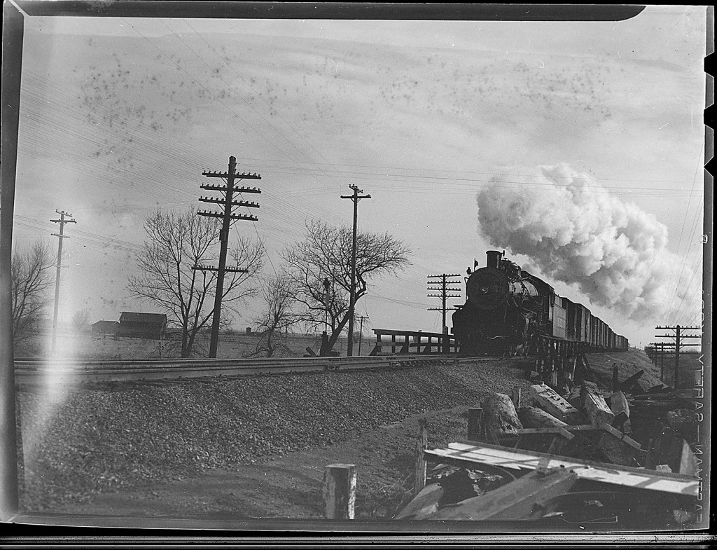 It’s a negative of a steam locomotive freight train. Identifying marks in this image could be the sign in the foreground at right in the wood debris pile.