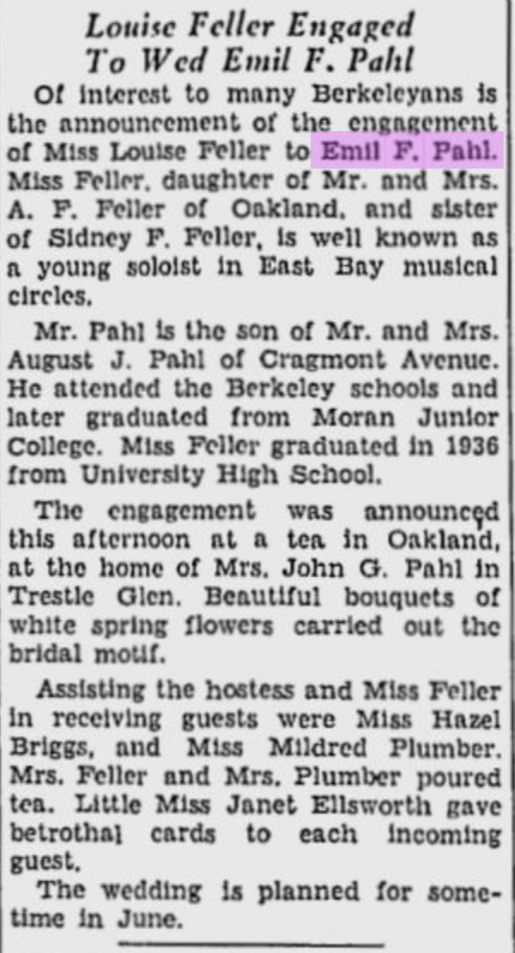 NOTE: Genealogical record below, engagement announcement of Emil F Pahl with Louise Feller. These small finds give us a good amount of insight.
