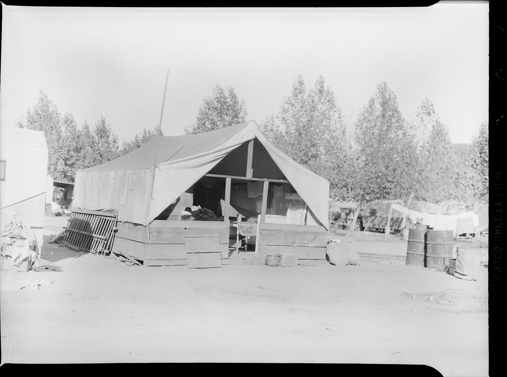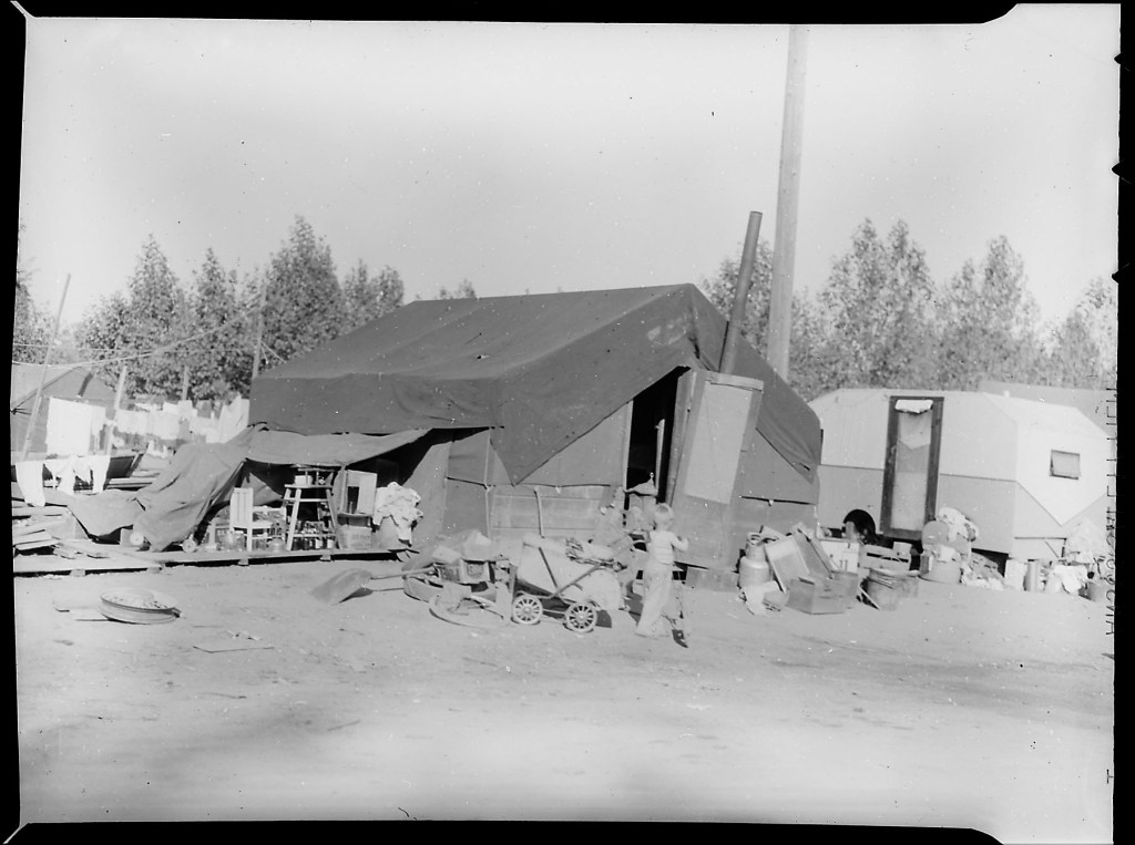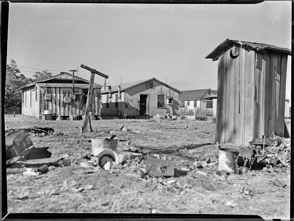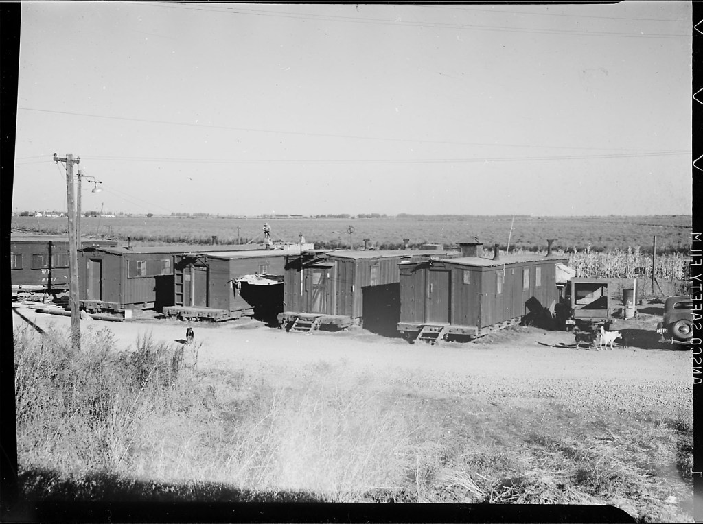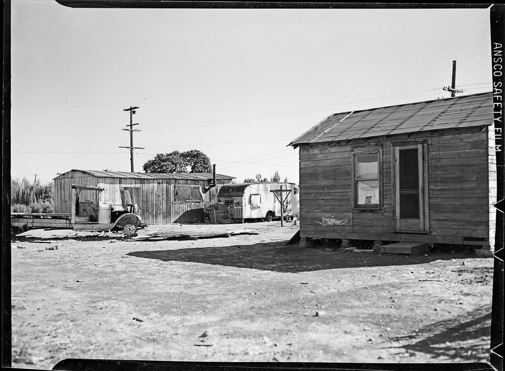 It shouldn’t be no surprise that alternative housing such as tents and run down trailers were also used as housing. Although Joel didn’t write down any clues about the next images, I firmly believe that these were photographed possibly in the Box Car City area or another area with seasonal labor. It’s clearly a collection of run-down living spaces with an accumulation of junk.