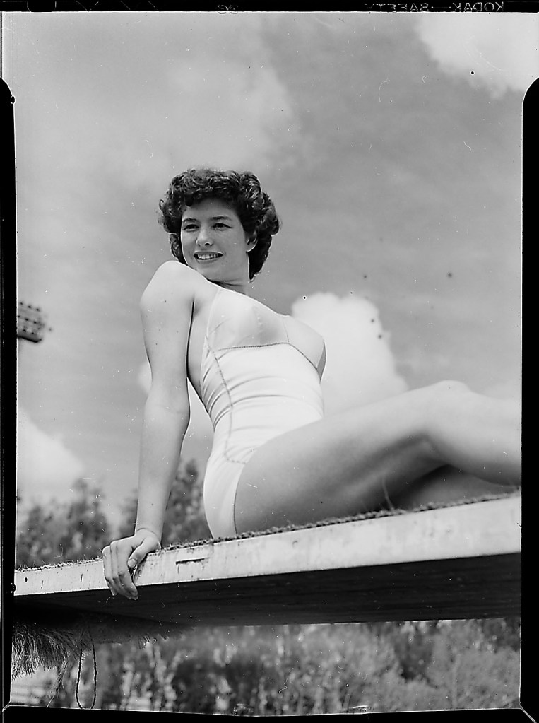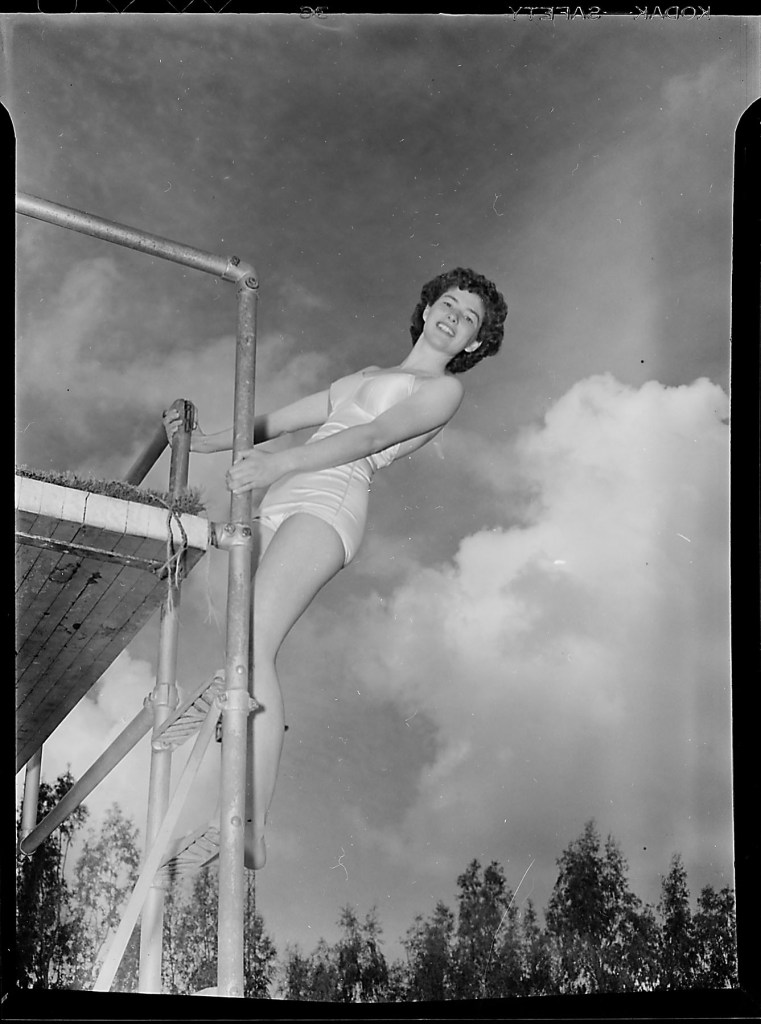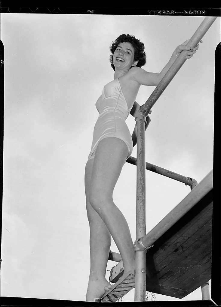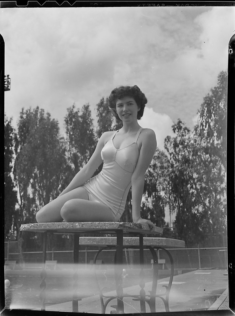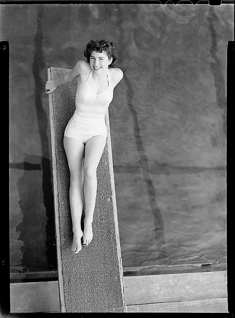 The photo shoot ends with poses on the diving board, a staple in pool photography at the time.
