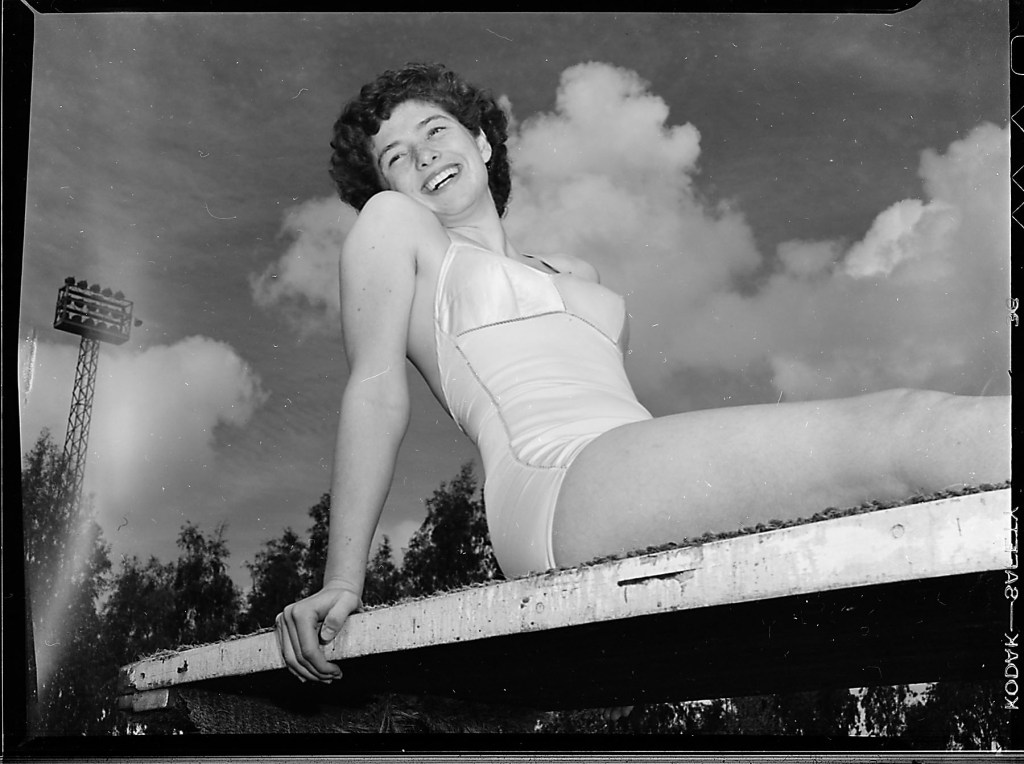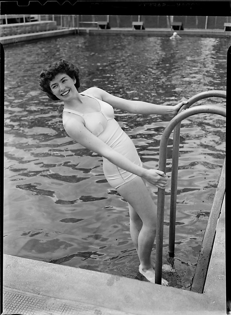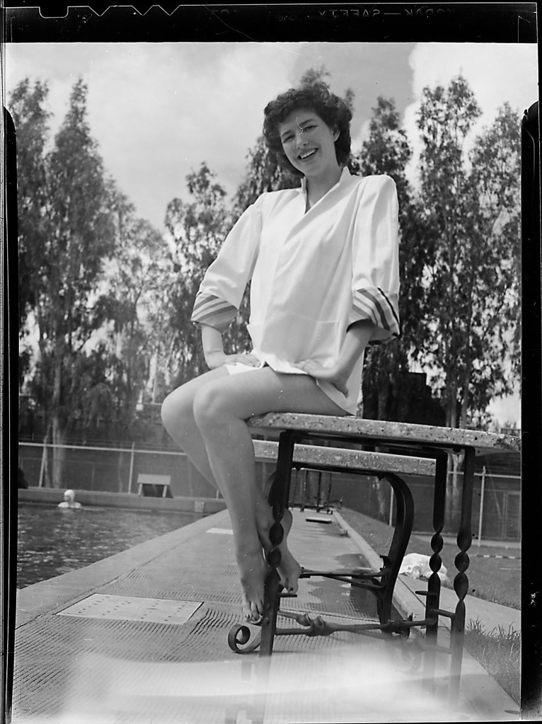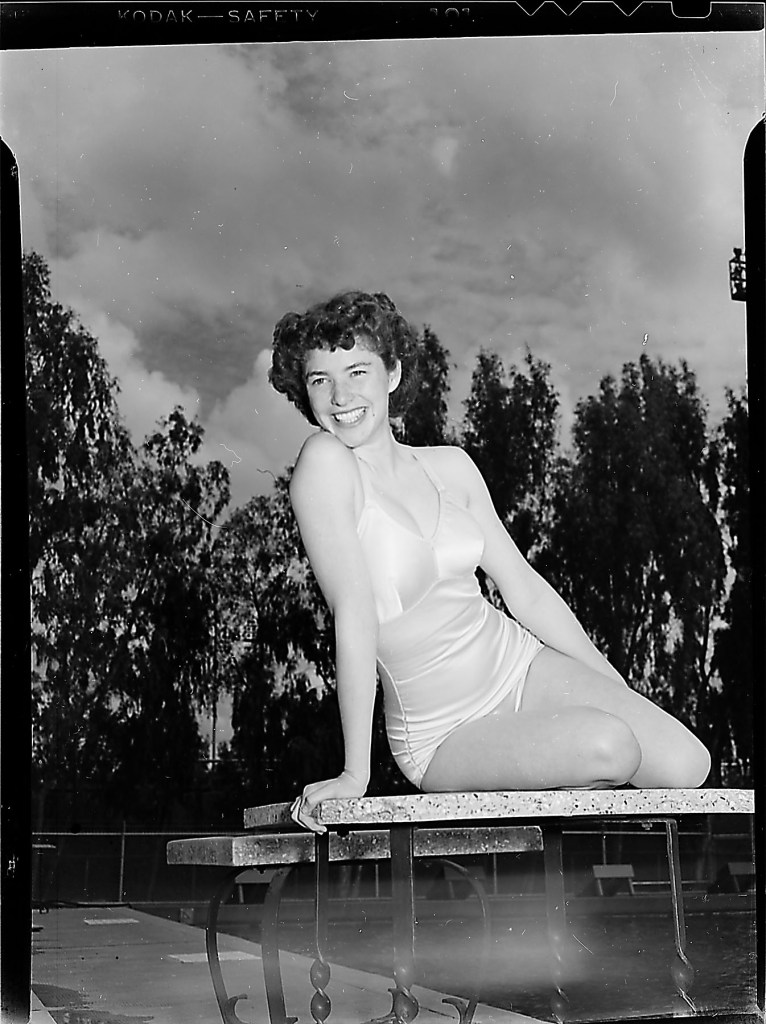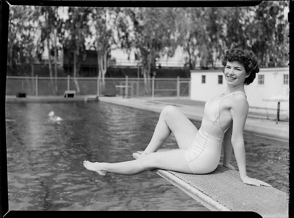 The photo shoot ends with poses on the diving board, a staple in pool photography at the time.