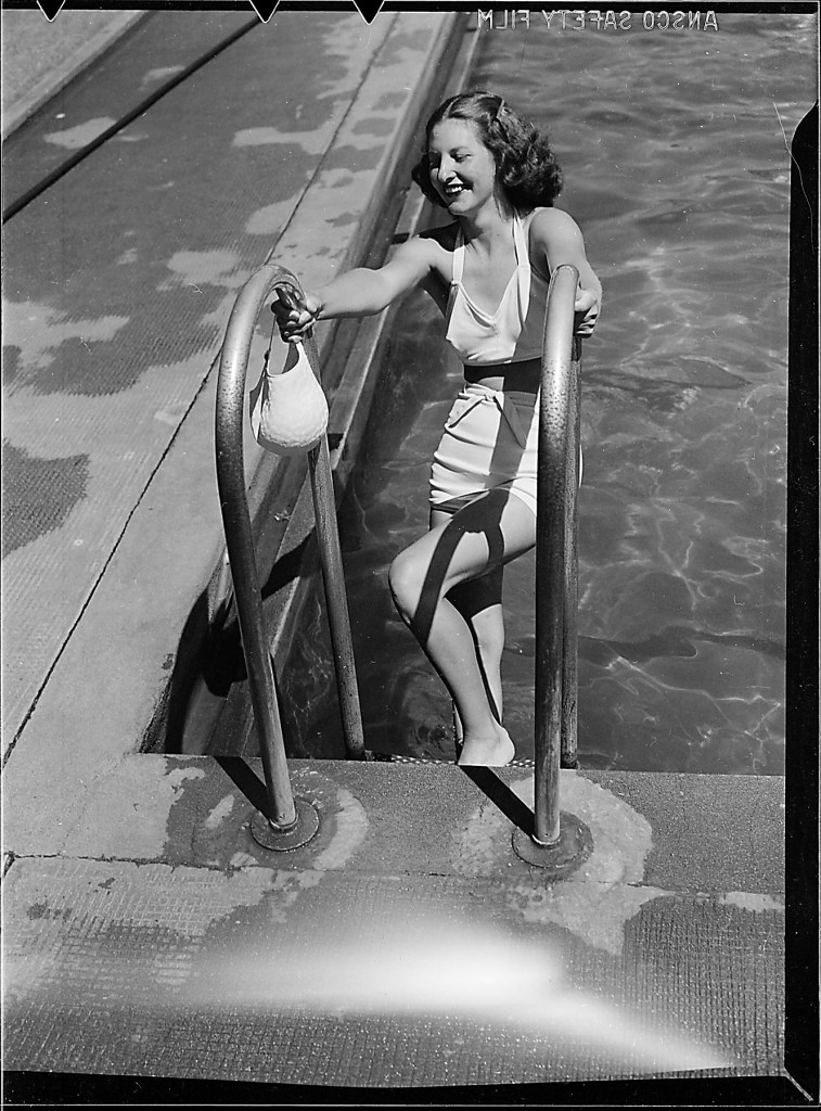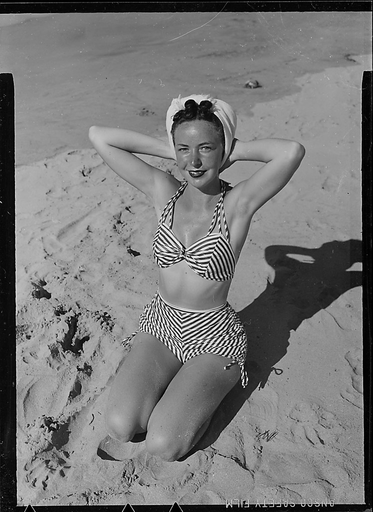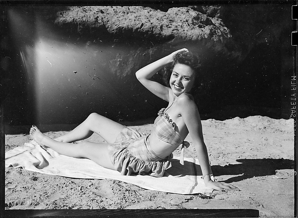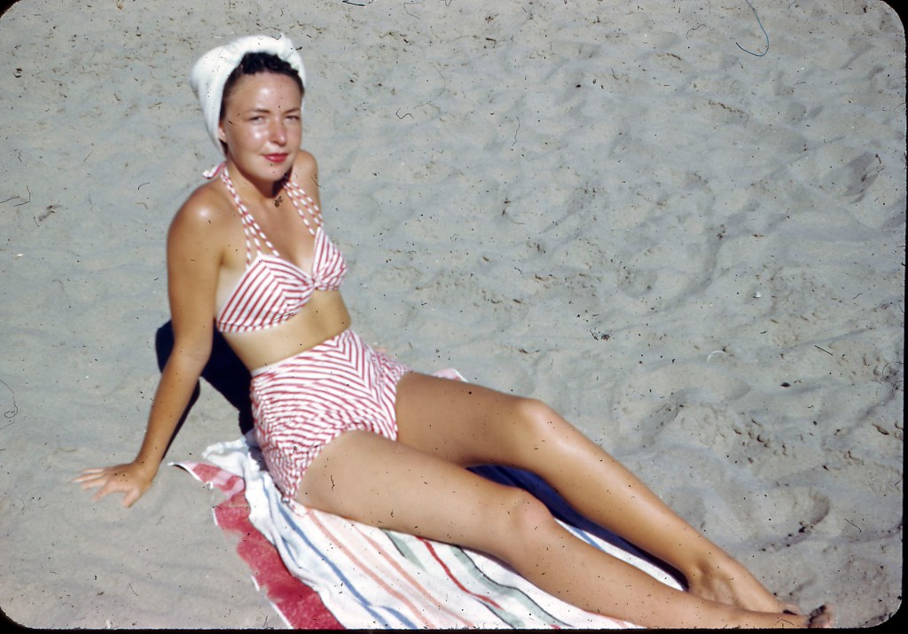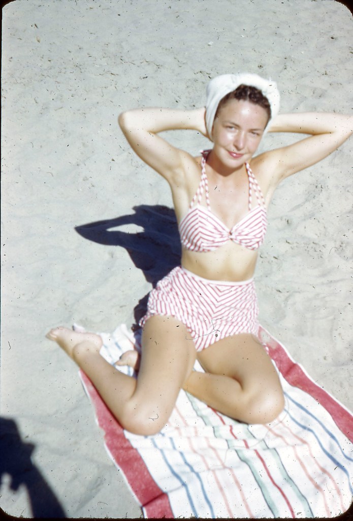 I had not shown the Kodachrome images before as they were in a 1942 box and I had questioned the time frame in light of subject matter. It’s the same young woman as in the B&W photo, the latter is minus the beach towel.