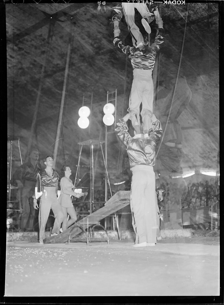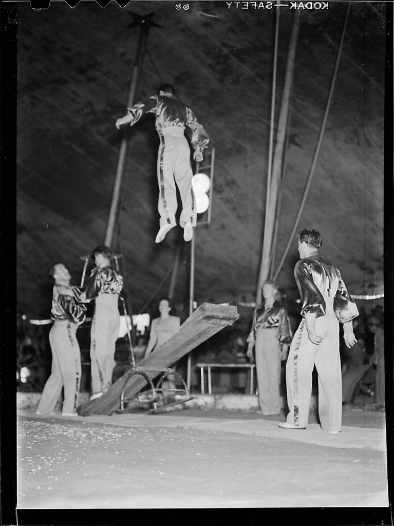 There are 4 negatives of a circus acrobat routine. This is from the Clyde Beatty Circus that was in Stockton, May 5, 1948.