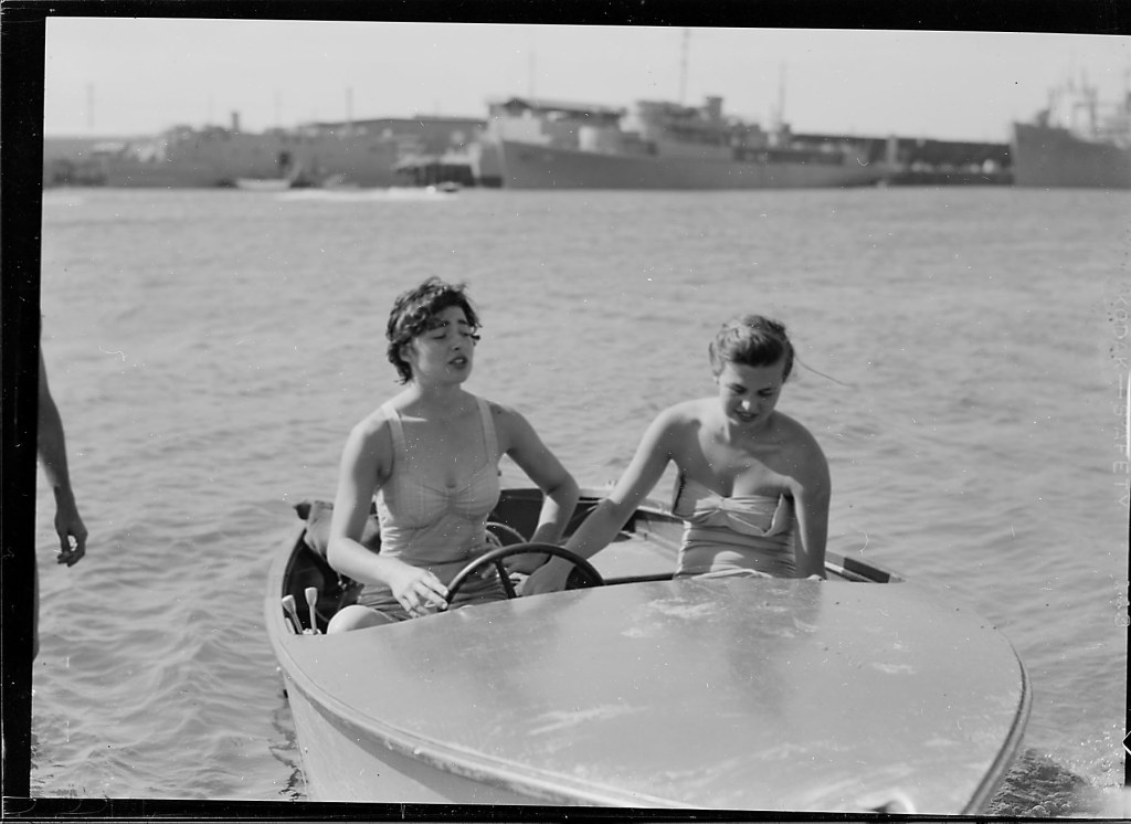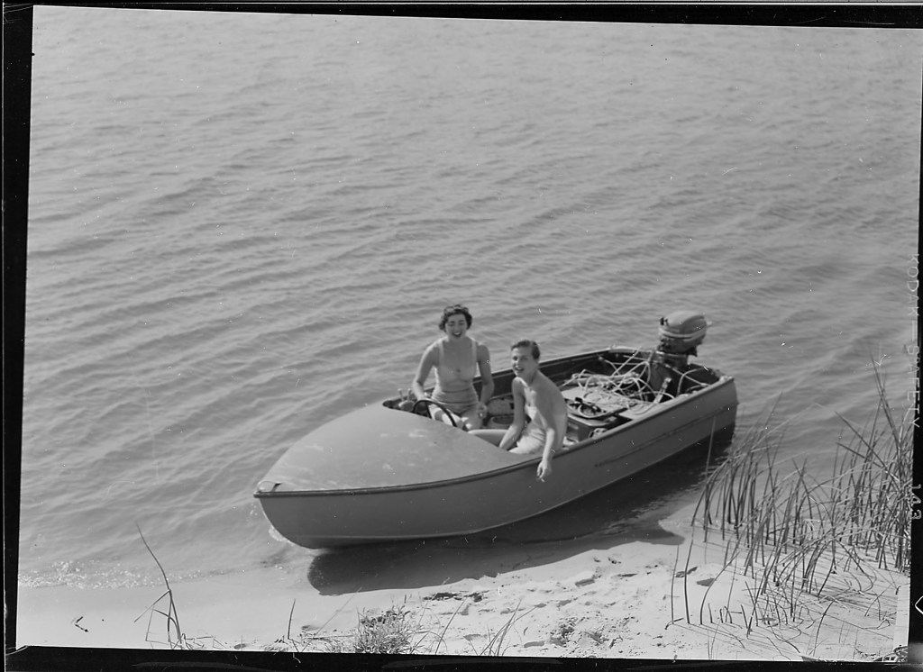 There are two images of Shirley and a friend in a small motorboat in the Stockton Harbor.