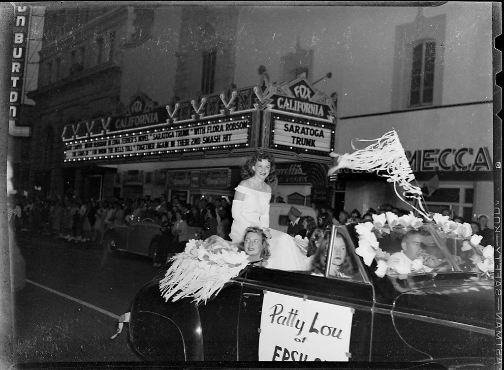Next slide is from a Homecoming Parade in Stockton. The image was taken in front of the Fox Theater, now Bob Hope Theater. Based on the marquis, we know for sure this image was taken sometime 1946. The film Saratoga Trunk is from November 1945, and played mostly in 1946.