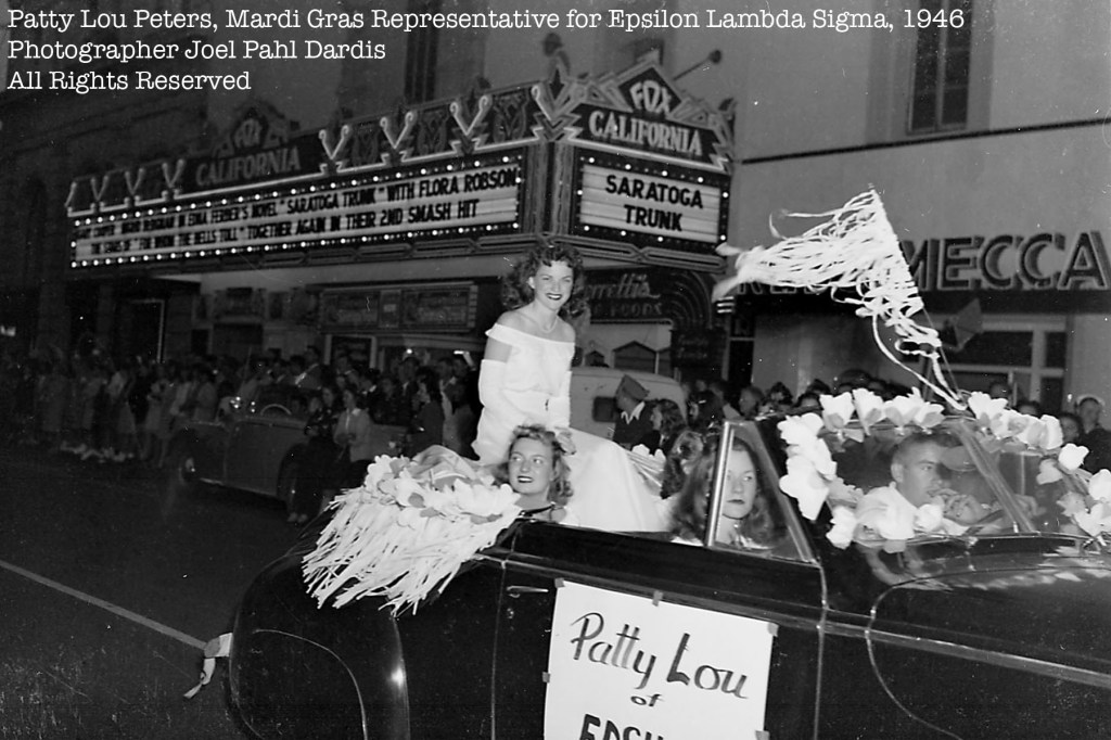 Patty Lou Peters was a native of Stockton and the Mardi Gras representative for Epsilon Lambda Sigma. She made a name for herself singing for various campus affairs. She was a sophomore in 1946