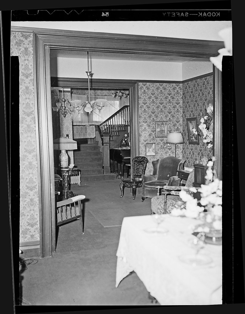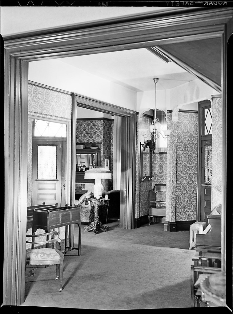 Looking at the foyer from the dining room through the parlor, Rossi House, March 28, 1949, Stockton