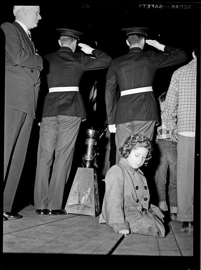 The “eternal flame”, solemn moment for the WWII casualties, carried from France to the United States may have been the focus, but all our eye really rests on is the child.