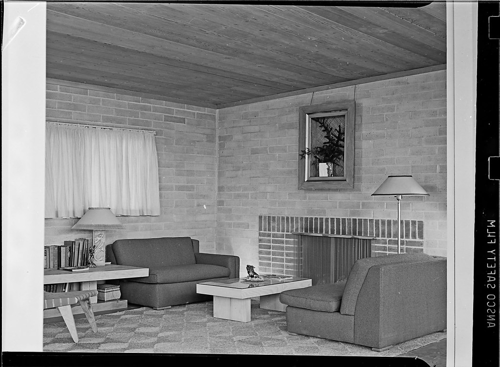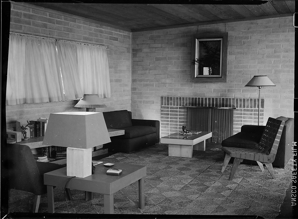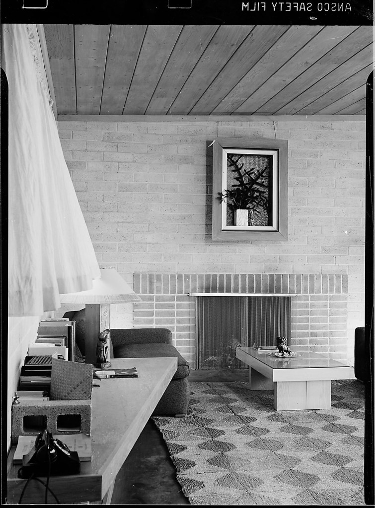 Reid’s House with its cinder block walls, brick fireplace, polished concrete floor and tongue-and-groove hardwood ceiling, is clearly a departure from the Craftsman house or California Bungalow.