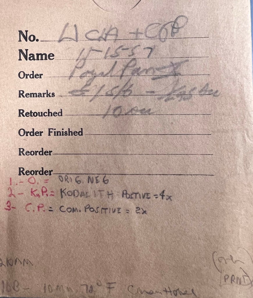 He also notes the lens focal length as 210mm, in addition he writes down the developer details at the bottom.