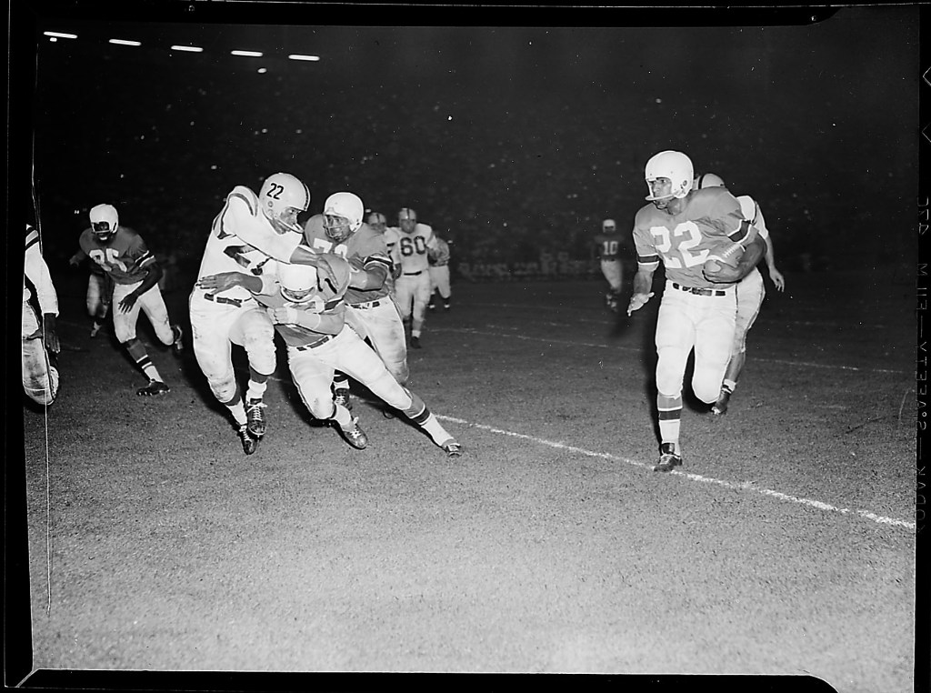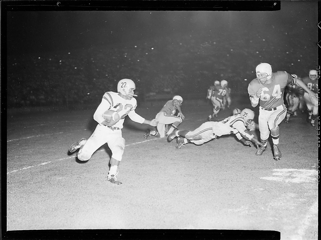 Oh, yes, keep an eye out for Dick Bass with the number 22 ! Below, Dick Bass gaining yards with able assistance from John Williams and Earl Moreno.