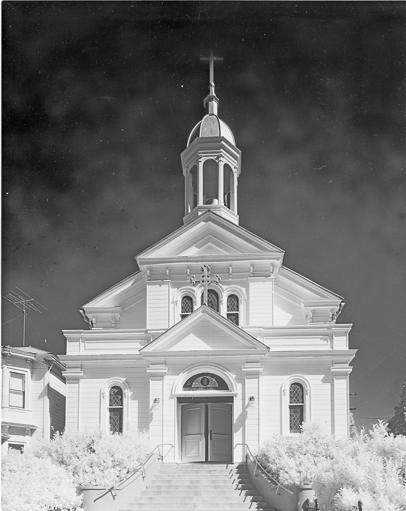 Two images below. One shot on regular B&W film stock, The second one is the same church on infrared film. Based on evidence so far, Joel engaged in systematic experiments comparing infrared film with regular B&W film for visual contrast.
