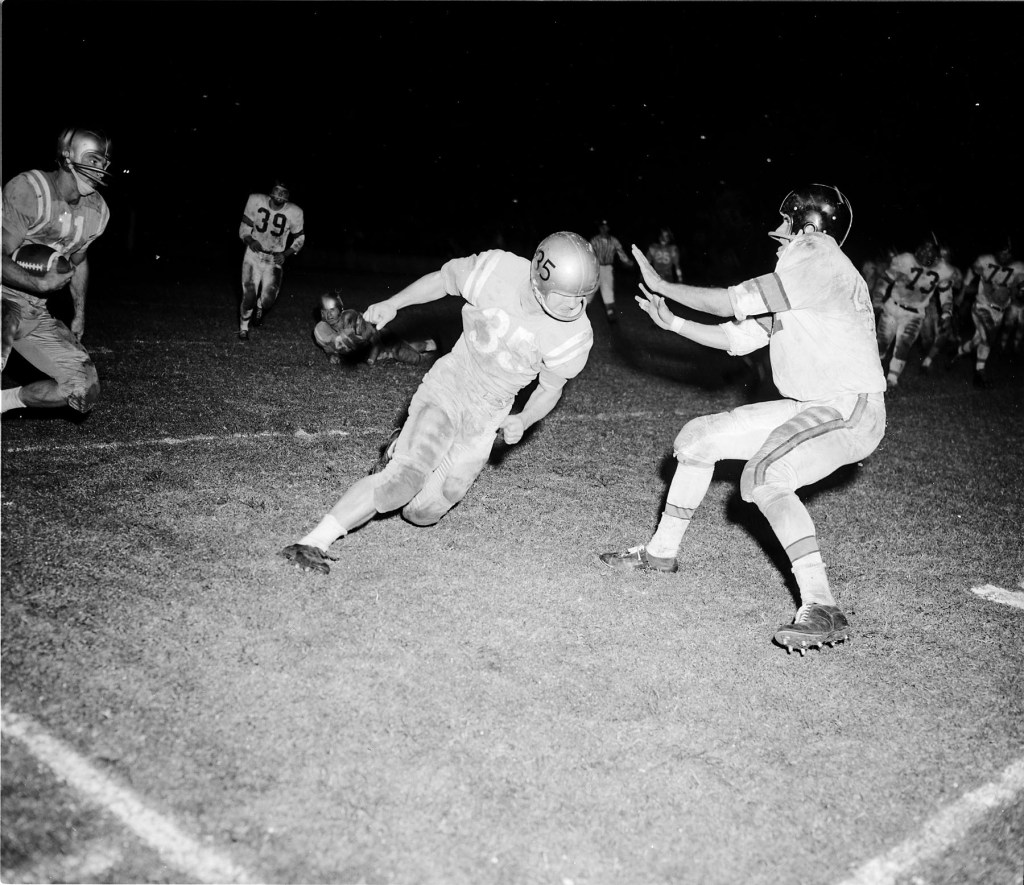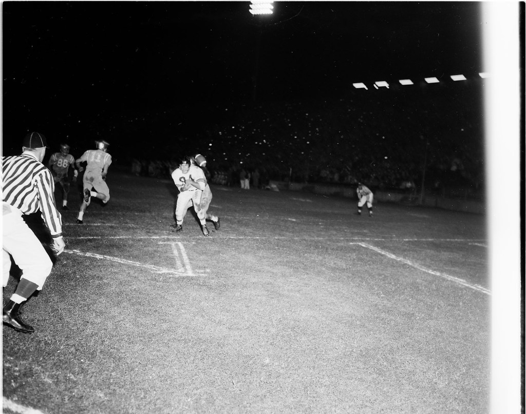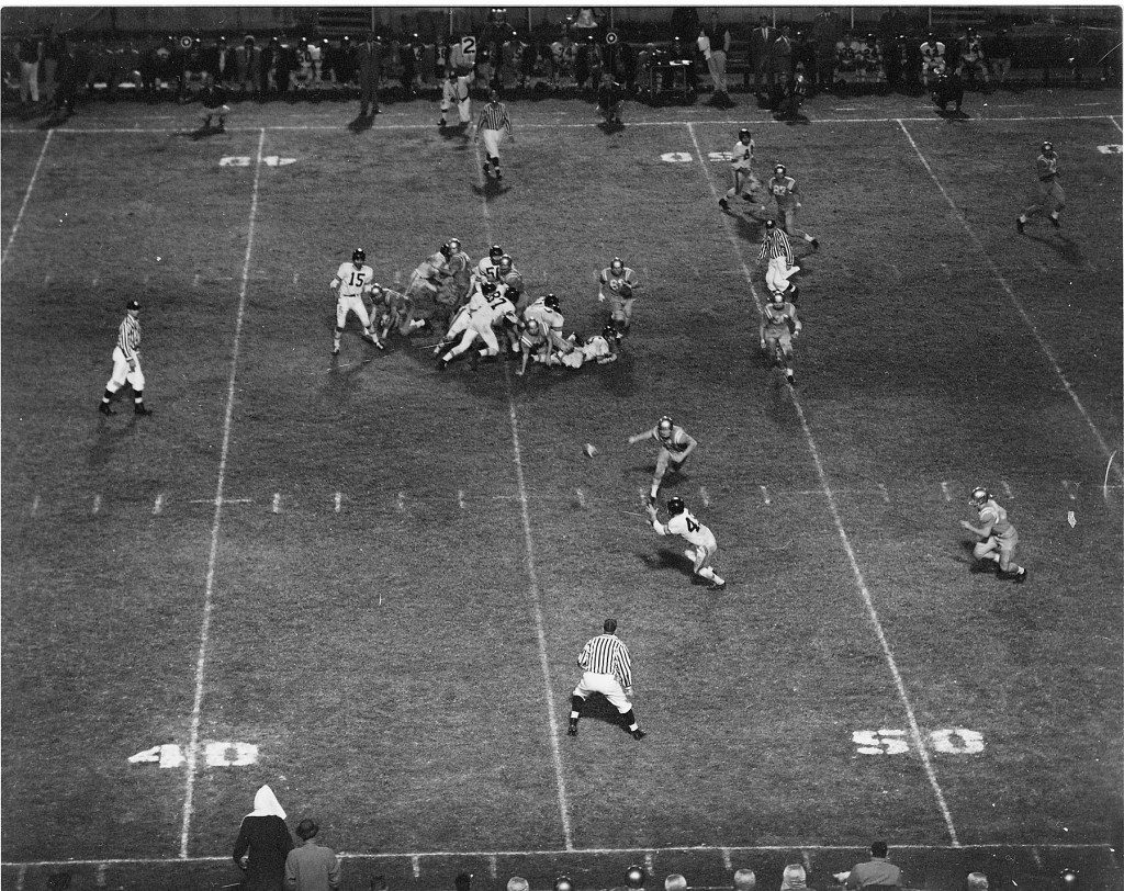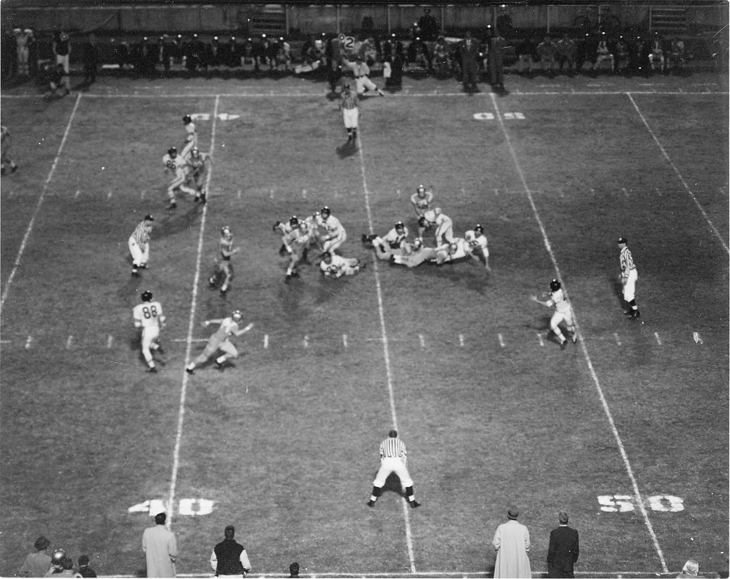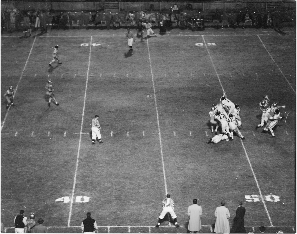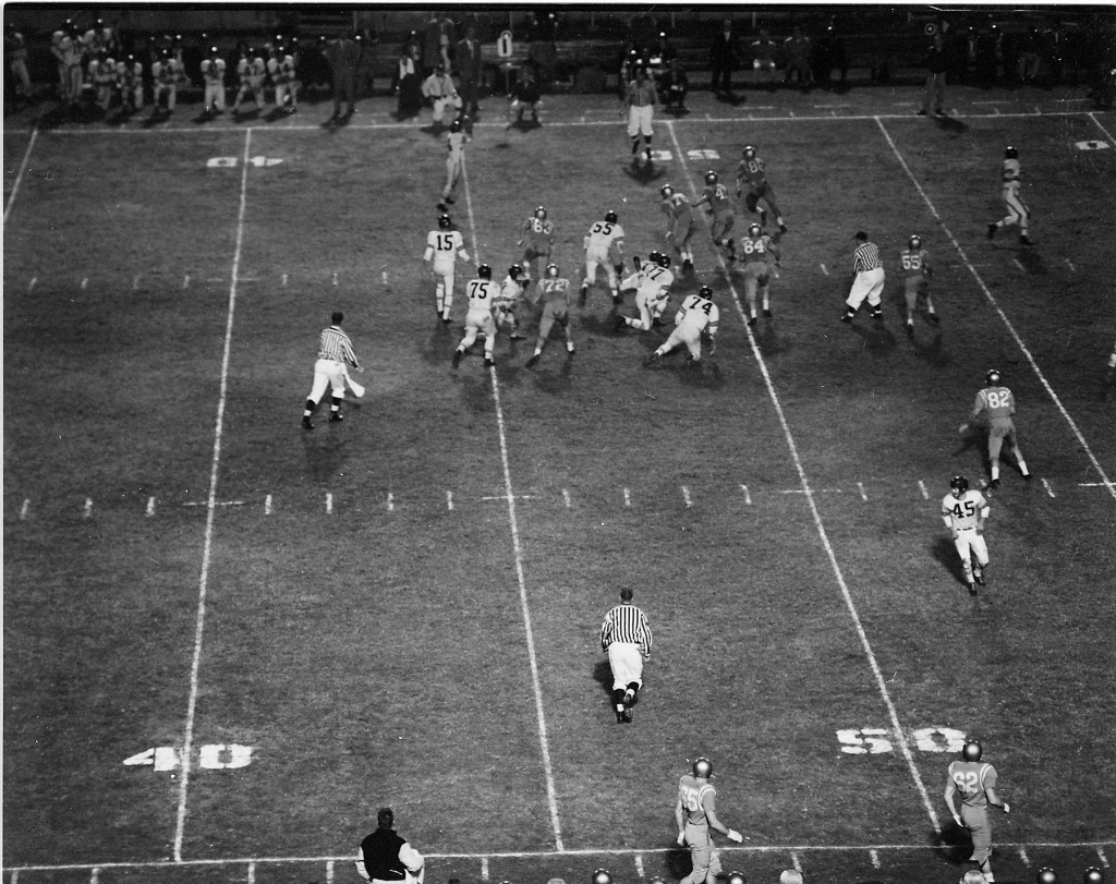 Based on the amount of slant in the images, I assume Joel photographed from two different locations, possibly changing his perspective during half-time. It is also clear, based on coverage angle, he is using two different telephoto lenses. These are most likely the 15″ and 20″ lens Joel documented testing in May 1957.