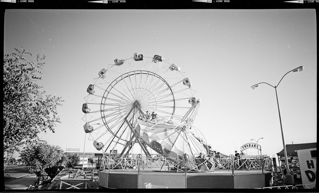 There’s a Firestone sign at left, just above the Bank of California sign. The plane ride says “TRABANT” at the entrance. Shopping cart barely visible in the center of the emage.