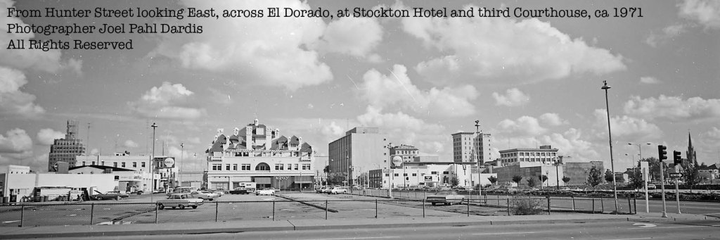 Needless to state that in the image below many buildings are very recognizable in the skyline. But the whole area is significantly changed since then. It’s actually quite refreshing to see the Stockton Hotel and the third Courthouse from this location.