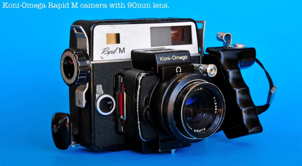 The camera Joel is holding is Koni-Omega Rapid, a camera released after 1964 and based on the Simmons design of 1953. Joel shoots 120 or 220 roll film on this camera (2 1/4″ wide film). It was not possible to shoot Polaroid pack on this camera.